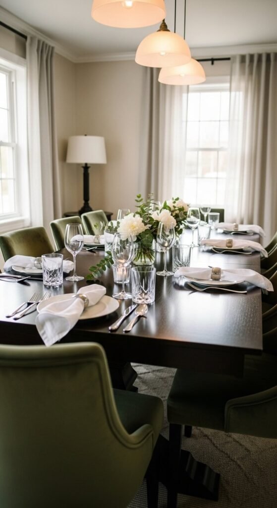 The dining room does not have to look the same year-round. Small seasonal touches keep the space feeling alive and relevant. Swap a centerpiece from dried pampas to spring branches. Change a tablecloth from white linen to a warm plaid. Add a small pumpkin or pinecone grouping on the sideboard in autumn. These small rotations cost almost nothing and make the room feel cared for. It also gives you a reason to notice and appreciate the space more often.