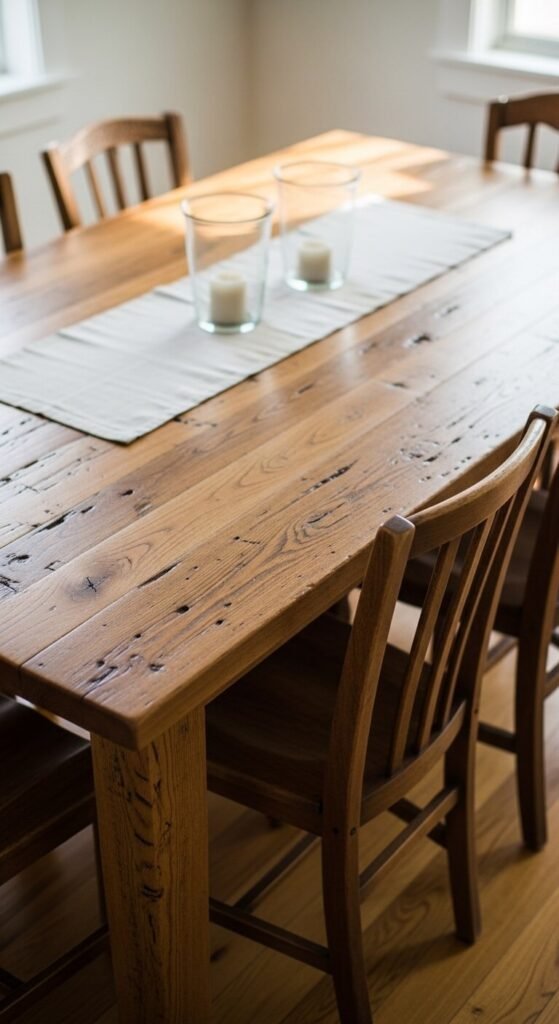 The table is the soul of the dining room. Choose one that fits your space without crowding it. A good rule: leave at least 36 inches between the table edge and the wall. Reclaimed wood tables add warmth and character without the luxury price tag. You can also sand and restain an old table yourself using a kit from any hardware store. A sturdy, well-sized table makes every meal feel like an occasion.