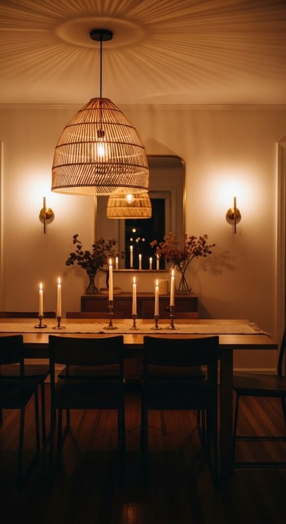 Overhead lighting alone makes a dining room feel flat. Layer at least three light sources. Start with a pendant or chandelier as the main fixture. Add wall sconces or a buffet lamp for ambient glow. Finish with candles on the table. Dimmer switches are a low-cost upgrade that completely changes the feel of a room at night. This simple shift makes dinners feel more intimate without any redecorating.
