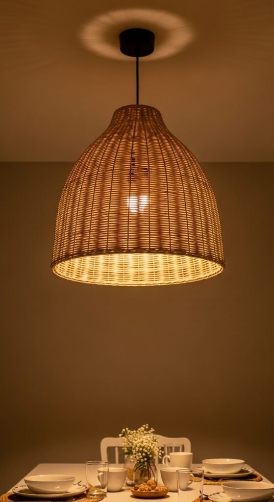 The pendant light is one of the first things people notice in a dining room. A woven rattan, seagrass, or bamboo fixture adds texture and warmth that a flat metal or glass shade simply cannot. These natural fiber pendants are widely available at many price points and suit everything from farmhouse to modern to coastal interiors. If you are renting, a plug-in pendant swapped over a standard light fixture is an affordable and removable alternative.