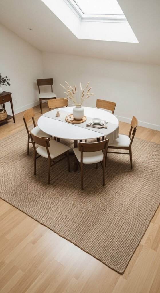 A rug pulls the dining room together and makes it feel finished. Make sure it is large enough — all chair legs should remain on the rug even when pushed out. For a standard six-seater table, an 8×10 rug is usually the minimum. Natural fiber rugs like jute or sisal are budget-friendly and durable. Layering a smaller printed rug on top of a plain one adds texture without a big spend.