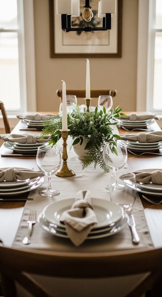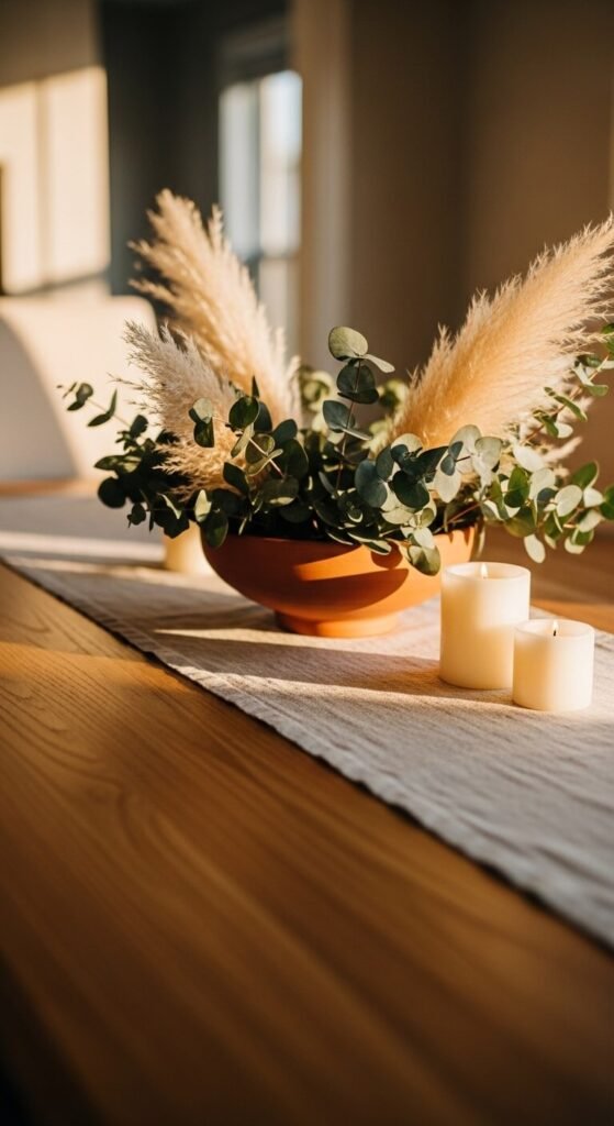 Centerpieces do not have to be expensive or formal. Organic textures like dried grasses, branches, terracotta, and linen feel warm and relaxed — exactly what a gathering space should feel like. A wide, low bowl of dried pampas grass and candles costs almost nothing and lasts for months. Skip the formal flower arrangement and go for something that lives on the table comfortably between meals without needing constant attention.