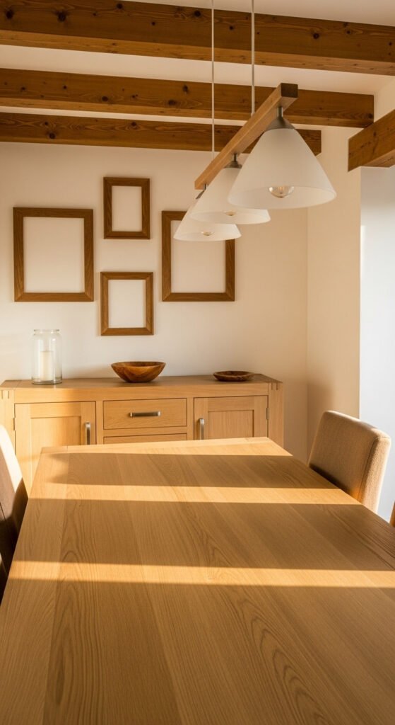 Wood brings life and warmth to any dining room. You do not have to replace your table or floor to get the effect. Add wood through smaller pieces — a wooden fruit bowl, cutting board on display, picture frames, or a simple wooden tray on your sideboard. These small additions create visual continuity and warmth across the room. Mixing light and dark wood tones is perfectly fine as long as they share a similar undertone — all warm, or all cool.