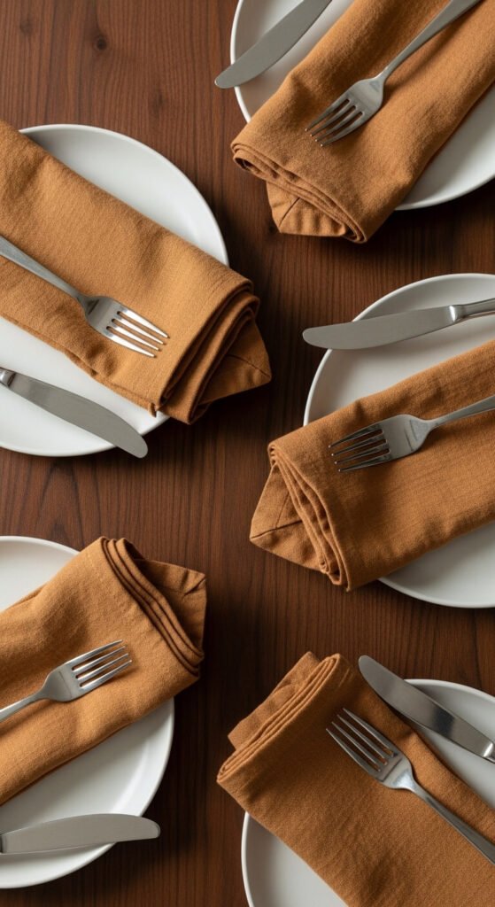 Paper napkins belong at a picnic. Cloth napkins instantly make a dining room feel more intentional. A set of affordable linen or cotton napkins in a neutral tone will last for years. Washed linen wrinkles beautifully and does not need ironing — the relaxed texture is part of the charm. Mix and match different tones of the same color for a casual but considered look. Rolled in napkin rings or simply folded on the plate, they change everything.