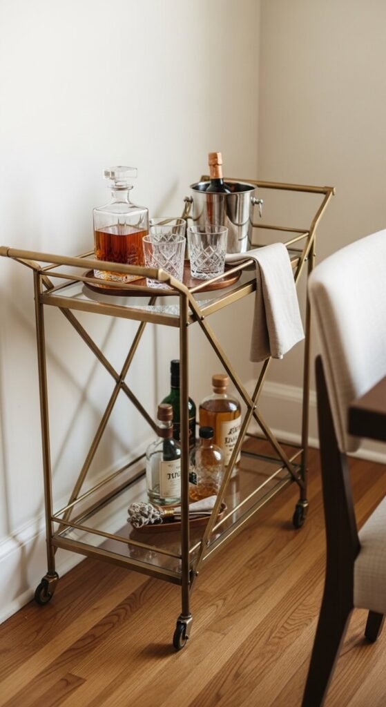 A bar cart or small drinks station near the dining room adds convenience and personality. It signals that guests are welcome to linger and self-serve. A basic rolling cart from a home store or thrift shop works perfectly. Stock it with a few decanters, glassware, and a small ice bucket. Even a dedicated corner of your sideboard works. This small addition makes hosting feel effortless and gives the room a life-of-the-party energy.