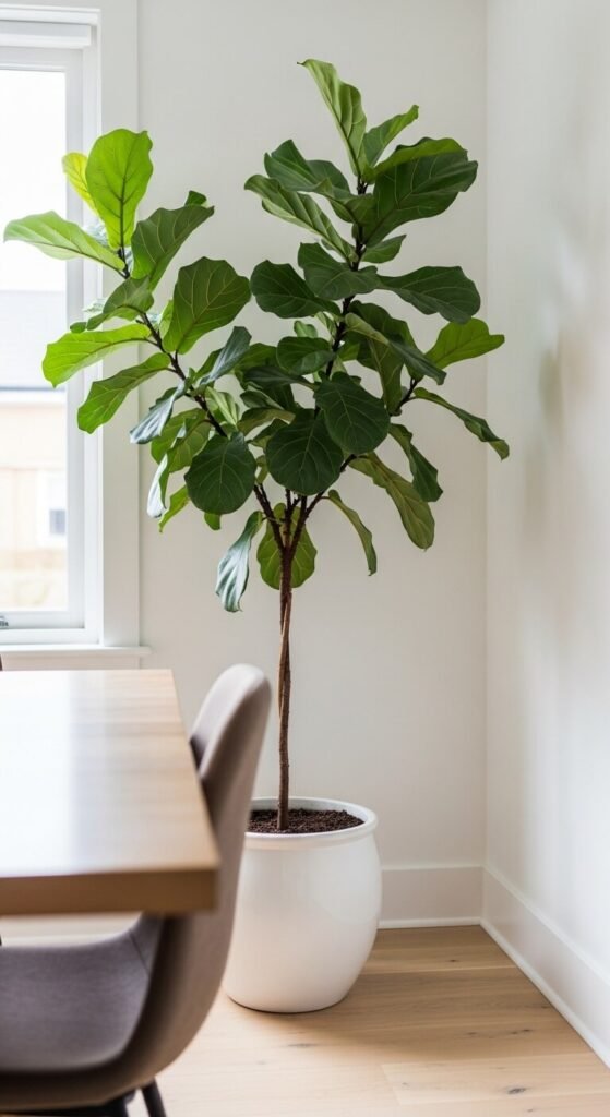 A living plant transforms the feeling of a dining room instantly. A large floor plant like a fiddle-leaf fig or olive tree in the corner adds height and organic life that no decor item can replicate. If you do not have a green thumb, pothos and snake plants thrive in low light and are nearly impossible to kill. A simple white or terracotta pot costs very little. Even a small herb plant on the sideboard adds freshness and a hint of the garden to every meal.