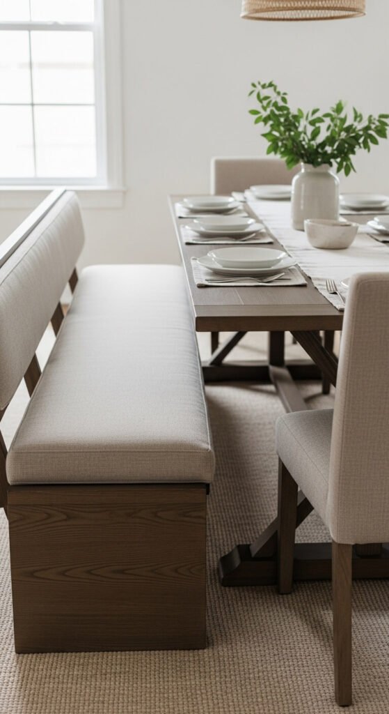 A matching dining set can feel stiff and showroom-like. Try using two upholstered armchairs at the heads of the table and simple wooden chairs along the sides. Stick to a single color family — warm neutrals, all black, or natural wood tones — so the mix feels intentional. Thrift stores and online marketplaces are great sources for affordable accent chairs. Reupholstering a seat cushion costs very little and makes a big difference.