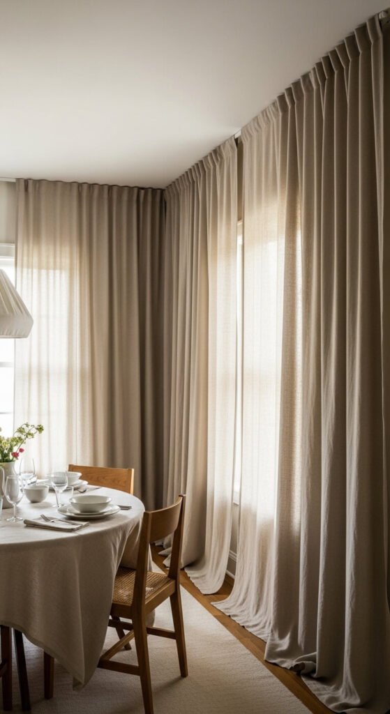 Curtains that stop short of the floor look unfinished. Always hang them high and let them reach the floor. Mount the rod 4 to 6 inches above the window frame and extend it several inches on each side. This makes windows look taller and rooms feel larger. Ikea and other budget stores sell affordable linen-look curtain panels that work beautifully in a dining space. A single pair can completely reframe the room.