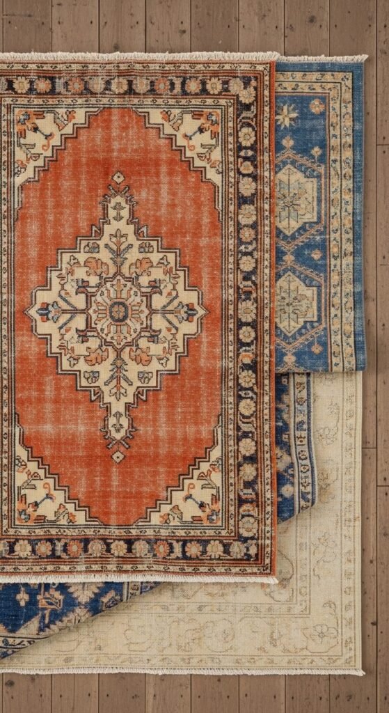 Place a larger neutral jute or sisal rug as your base, then layer a smaller vintage kilim or Persian-style rug on top. This trick works anywhere—entryways, under dining tables, or beside your bed.