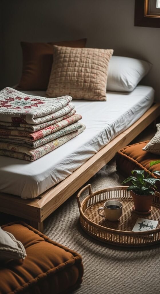 Mix suzani pillows with Mexican blankets, Indian block prints with Moroccan wedding blankets. Don’t match too perfectly—the slightly mismatched look feels more authentic and collected.