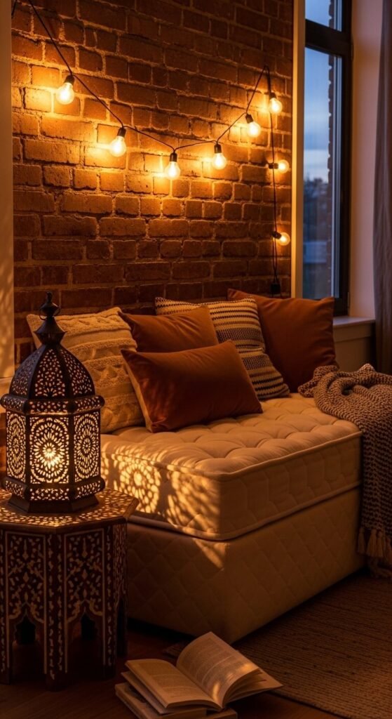 Soft lighting creates that magical, lived-in atmosphere boho spaces are known for.
