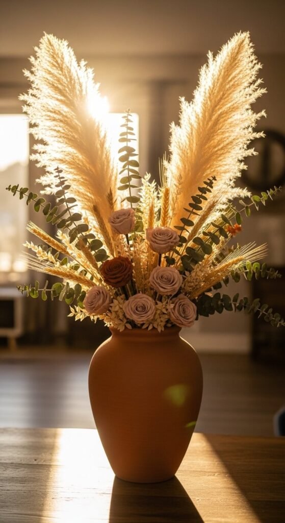 Change arrangements seasonally—wheat and dried hydrangeas in fall, bleached branches in winter. The neutral tones work year-round without clashing with other decor. Shake gently outdoors every few months to remove dust.