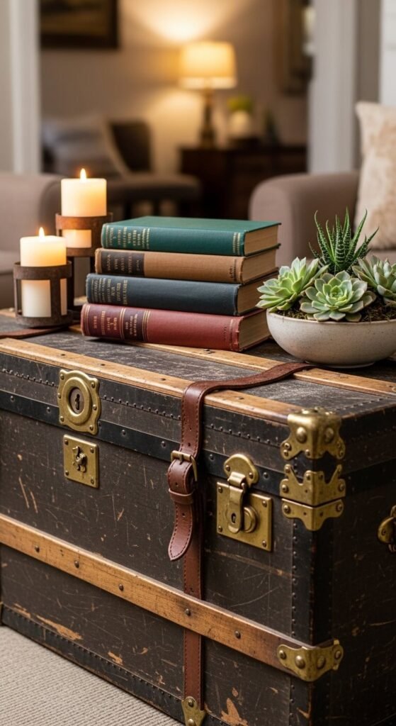 Scout flea markets and estate sales for authentic travel trunks at $50-$200. They hide blankets, off-season clothes, or board games while functioning as coffee tables or entryway benches.