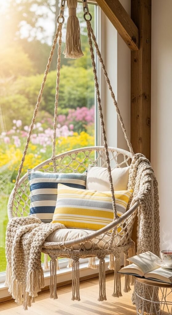 Hammocks stretched between posts create outdoor lounge areas for under $50. Indoor options need strong anchor points, so check your ceiling joists before drilling. Hanging chairs work in corners where traditional furniture won’t fit.