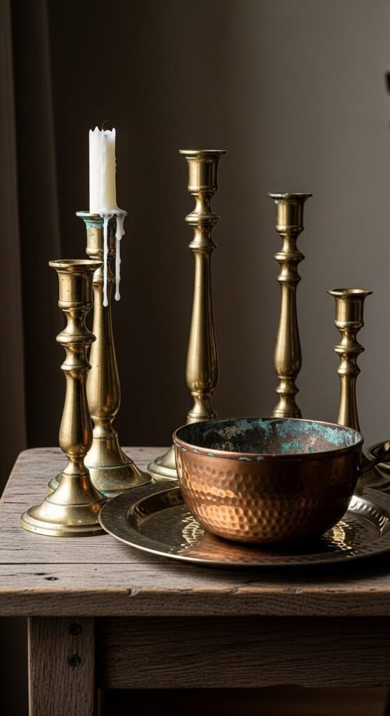 Let brass and copper develop natural patina rather than polishing them constantly. The aged finish looks more authentic and requires zero maintenance.