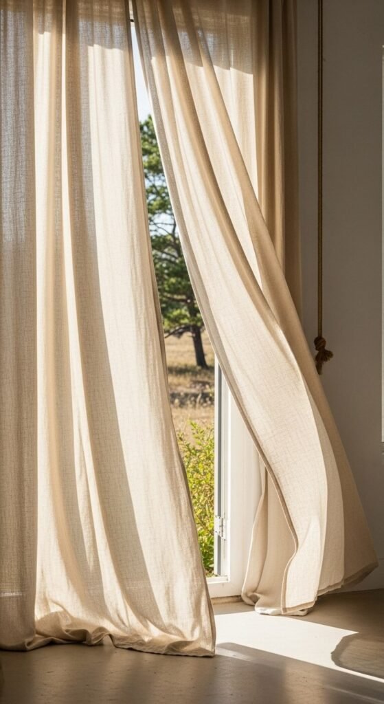 IKEA’s linen curtains start at $30 per panel, while custom options run $60-$150. Hang them from natural wood or simple brass rods rather than ornate hardware.