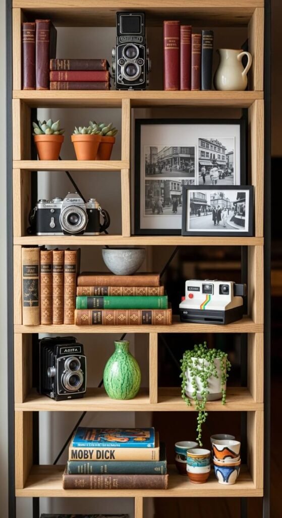 Group collections by color, size, or theme on open shelves. Vintage cameras, old books, rocks, or travel souvenirs become conversation pieces when arranged thoughtfully.