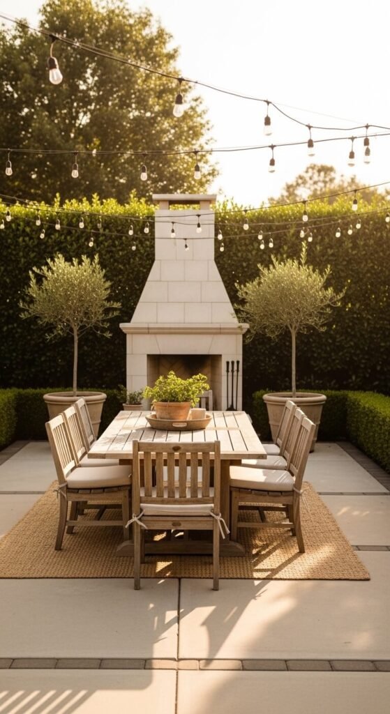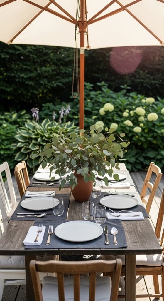 Eating outside changes the whole feel of a meal. A weatherproof dining set doesn’t have to be expensive — thrifted pieces painted with outdoor furniture paint work beautifully. Add a large market umbrella for shade and a weather-resistant tablecloth for easy cleanup. String lights above create ambiance after dark. A small outdoor rug under the table defines the space and makes it feel intentional. Even a small deck or patio can fit a four-person table with the right layout.