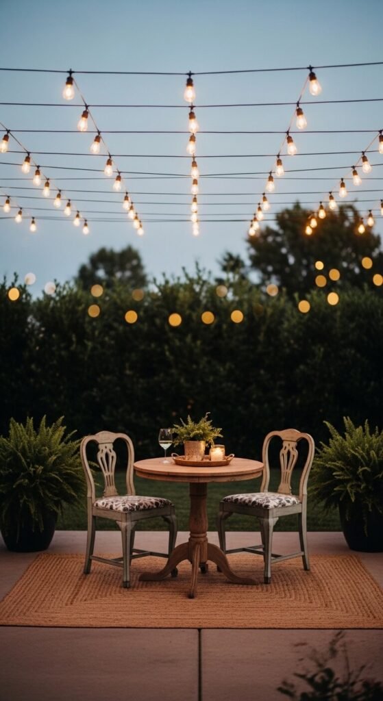 String lights are the fastest way to make any patio feel like a destination. They cost under $30 and can be hung from fence posts, pergola beams, or simple shepherd’s hooks. Choose warm white Edison bulbs for the most welcoming glow. Add a small bistro table and two chairs, and you have a spot for morning coffee or evening wine. No electrician needed — most sets plug into a standard outdoor outlet. It’s a one-afternoon project with a big payoff.