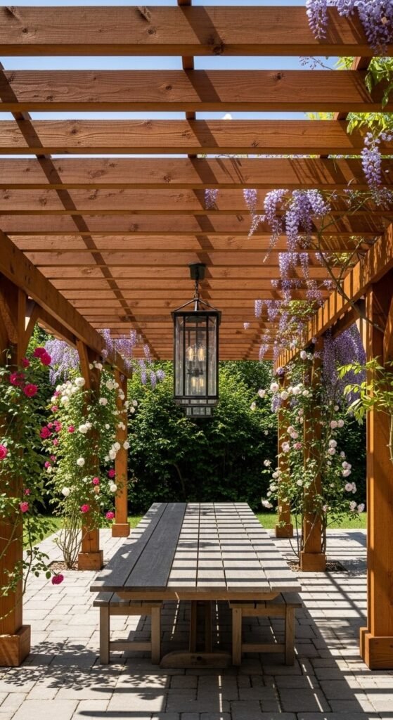 A pergola adds structure and shade without closing off your yard. Freestanding kits start around $500–$800 at big-box stores and can be assembled in a weekend. Run climbing vines like jasmine or wisteria up the posts for natural cooling and color. Place a dining table underneath and it becomes an outdoor room year-round. Add a shade sail or fabric canopy for extra sun coverage on hot days. It’s one of the highest-return outdoor projects for resale value too.