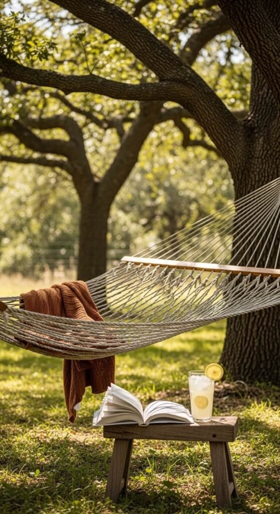 A hammock costs as little as $30–$80 and takes under 30 minutes to hang between two trees or on a freestanding frame. It immediately creates a relaxation zone with zero construction. Add a side table (even a tree stump works), a waterproof pillow, and a blanket. Place it under natural shade for the best experience. If you don’t have trees, a hammock stand gives you flexibility to move it around. This is the easiest outdoor upgrade on this entire list.