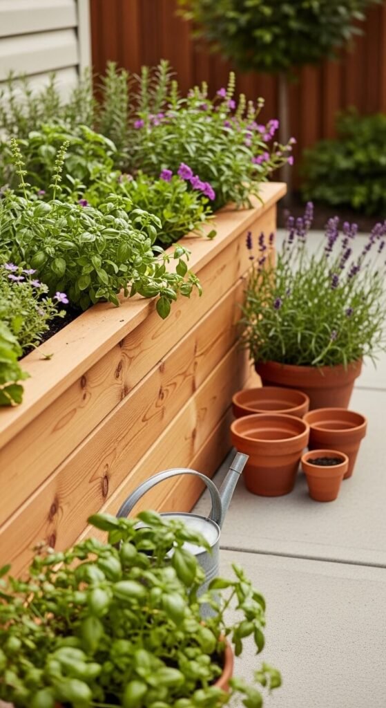 Raised garden beds along the edge of a patio do double duty. They define your outdoor space like a natural fence and give you a place to grow herbs, vegetables, or flowers. Cedar boards are affordable and rot-resistant — a basic 4×8 bed costs about $50 in materials. Plant low-maintenance perennials like lavender or rosemary for fragrance with almost no upkeep. Herbs near a cooking or dining area are especially practical. You can harvest fresh basil steps from where you eat.