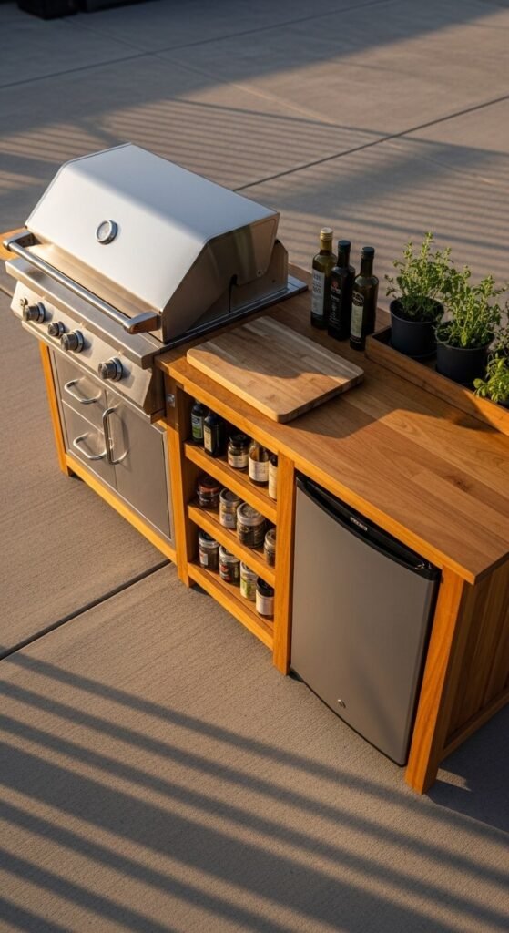 You don’t need a full outdoor kitchen build to cook outside comfortably. A good grill plus a prep station is the starting point. Add a weatherproof cart with a cutting board surface and shelves for tools and condiments. A small outdoor mini-fridge (around $150) keeps drinks and marinades cold. Hook a paper towel holder to the side and add a trash bin nearby. This setup handles everything from weeknight grilling to weekend cookouts without a permanent construction project.