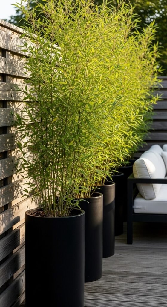 No fence? No problem. Tall potted plants create privacy without any construction. Bamboo in containers, ornamental grasses, or columnar evergreens work well. Line them along the edge of your patio or deck to block sightlines from neighbors. Use heavy-duty planters so they stay put in wind. Grouping different heights adds visual depth. You can rearrange them whenever you want, making this one of the most flexible outdoor privacy solutions available. Most options cost $20–$60 per planter.