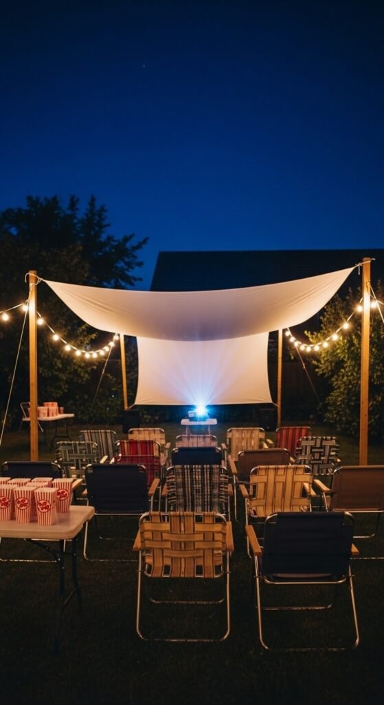 A blank fence or sheet hung between posts becomes a DIY outdoor movie screen for under $50. Pair it with a portable projector ($80–$150) and a Bluetooth speaker. Lay out blankets, floor cushions, or lawn chairs for seating. Set up a small snack station nearby. This works for summer weekends and is a hit for families or friend groups. The whole setup packs away in a closet when not in use, so it doesn’t permanently change your yard at all.