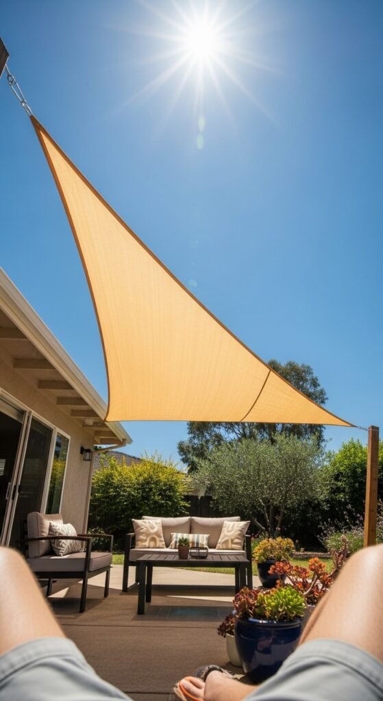 Shade sails are one of the most affordable ways to create a covered outdoor zone — prices start around $30 for a quality sail. They attach to posts, fences, or the side of your house with hardware kits. Triangle and rectangle shapes let you customize the coverage area. Overlap two smaller ones for full shade without needing a single large structure. They come in UV-blocking fabric that can reduce the temperature underneath by up to 10 degrees. Take them down seasonally for storage.