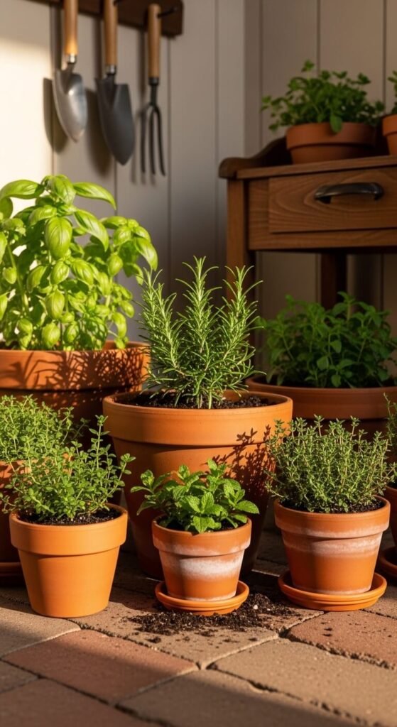 A dedicated herb corner on your patio means fresh ingredients are always a few steps away. Use terracotta pots of varying heights for visual interest — they’re cheap and breathable for roots. Group them together near your grill or dining area. Label each pot with a small painted rock or stake marker. Water them every few days and trim regularly to keep them producing. Mint, basil, rosemary, and chives are the easiest starters. Total setup cost: under $40 for pots and starter plants.