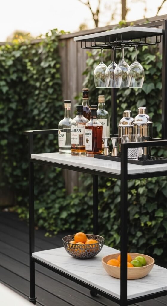 A rolling bar cart is one of the most underrated outdoor additions. It moves around easily, requires zero installation, and costs $60–$150 for a decent outdoor-rated model. Stock it with glasses, a cocktail shaker, a cutting board, and mixers. Tuck it under a pergola or beside your seating area. When the season ends, roll it inside. Add hooks on the side for a bottle opener or napkins. It gives your outdoor entertaining setup a finished, intentional feel without any construction.