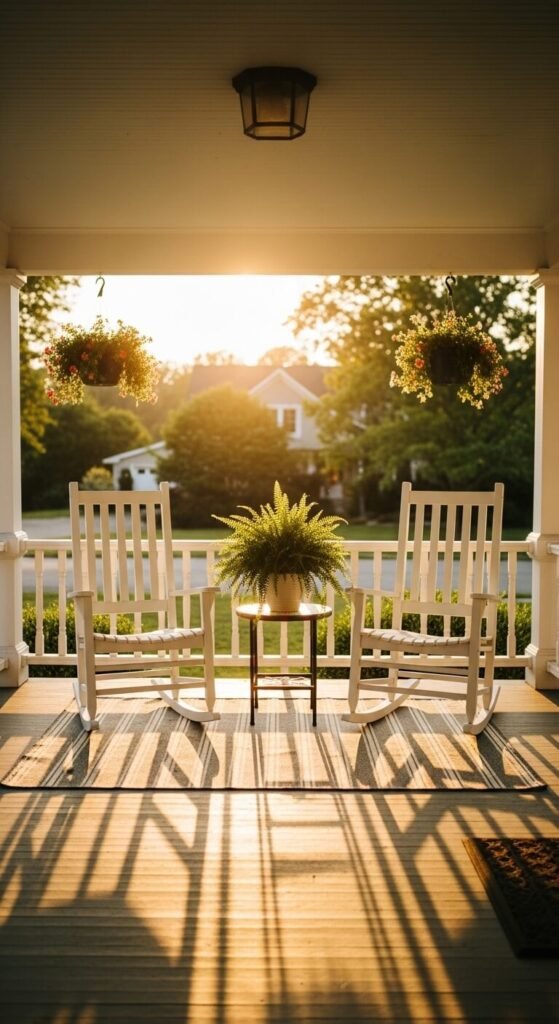 Front porches are often overlooked as actual living spaces. Two rocking chairs and a side table are all it takes to make one functional. Add a potted plant or two and a small outdoor rug. Hang a porch swing if space allows — kits start around $100. Use your porch for morning coffee, afternoon reading, or evening conversation with neighbors. It extends your home’s usable square footage without adding a single square foot. It also adds significant curb appeal with minimal investment.