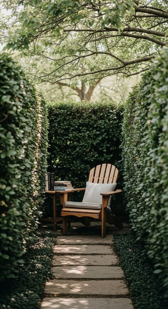 Create a dedicated reading spot by tucking a comfortable chair into a sheltered corner of your yard or garden. Use hedges, trellises, or a garden arch to give it a sense of enclosure. Add a side table for your drink and a solar-powered lantern for evening light. A weatherproof cushion makes the chair comfortable for long sits. This doesn’t require much space — even a 5×5 foot corner works. It gives you a reason to go outside even when you just want quiet, uninterrupted time alone.