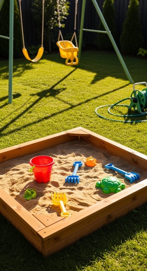 Designating a specific area for kids to play keeps the rest of your yard usable for adults. A sandbox is cheap and easy — build a frame from 2×6 boards and fill with play sand for under $60. Add a small swing set or balance beam. Use rubber mulch underneath to cushion falls and reduce mud. Keep a bin nearby for outdoor toy storage. Having a clear zone means kids know where their space is, and you keep your lounge or dining area free for grown-up use.