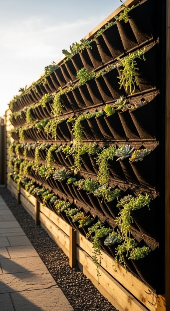 If ground space is limited, go vertical. Vertical garden systems — felt pocket planters, pallet shelving, or modular panels — mount to a fence or wall and can hold dozens of plants. Succulents, trailing plants, and small herbs work well. A full setup costs $30–$80 depending on size. This is especially effective for apartments, townhomes, or small urban yards where every square foot matters. It also adds texture and color to a plain fence or exterior wall that would otherwise just sit there unused.