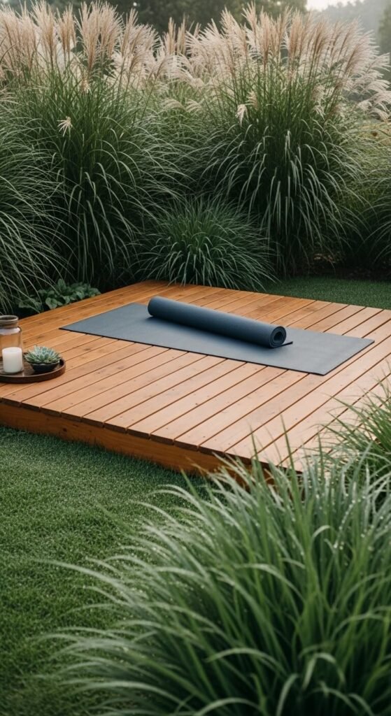 A flat, clean surface away from foot traffic creates a natural outdoor yoga or meditation space. A small floating deck — 8×8 feet of composite decking — can be built for a few hundred dollars. Or simply lay interlocking deck tiles on an existing flat area for under $100. Clear the space of furniture and use it as needed. Add a small shelf or tray for candles and a water bottle. Morning workouts or stretching sessions feel completely different when you’re surrounded by fresh air and nature.