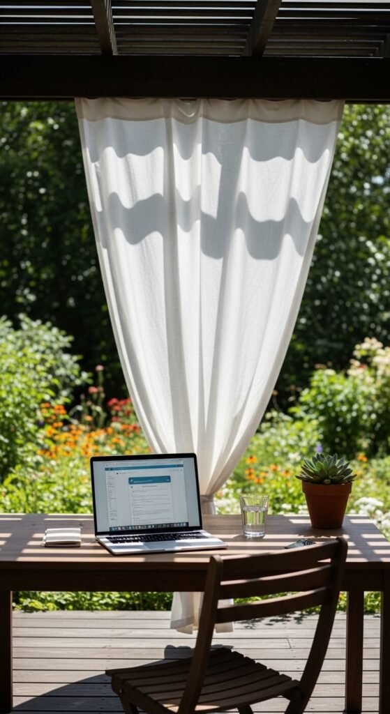 Working from home doesn’t mean working indoors. A weatherproof desk and Wi-Fi extender let you take your workday outside. Use a solid wood or metal outdoor table as a desk. A market umbrella or shade sail handles sun glare on screens. An outdoor extension cord powers your devices. Even working outside for two hours a day changes your mood and focus dramatically. Keep it simple — you don’t need a permanent setup. A folding table and chair that comes out each morning is enough.