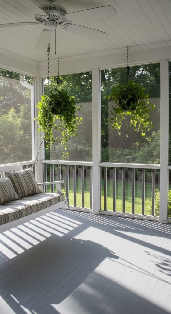 A screened porch bridges indoor and outdoor living better than almost anything else. If you have an existing covered porch, adding screens is a weekend project. Screen panel kits are available for around $200–$400 depending on size. You get protection from bugs and rain while still being fully outside. Add a ceiling fan, wicker furniture, and outdoor rug. Screened porches are usable in more seasons than open patios because rain doesn’t stop you. They also add real square footage value to your home.