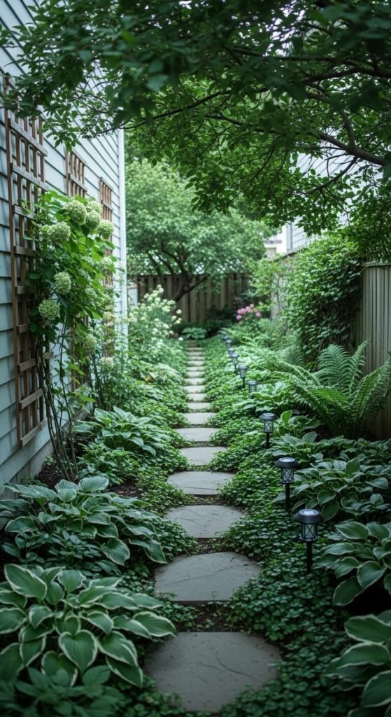 Side yards are almost always wasted space. Turn a narrow side yard into a garden corridor with stepping stones, ground cover plants, and simple lighting. Lay flat stepping stones for a clean path. Plant shade-tolerant ground covers like hostas or creeping Jenny along the edges. Add a trellis along the fence with a climbing plant. Install solar path lights for nighttime visibility. This makes the side yard something you actually walk through intentionally — and turns a forgotten strip of ground into a genuinely pleasant part of your home.