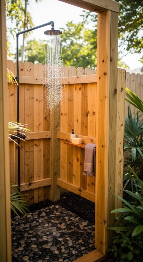 An outdoor shower is more useful than most people think. It’s not just for beach houses. Rinse off after gardening, cool down on a hot day, or wash muddy dogs before they come inside. A basic outdoor shower can be built with a garden hose adapter and a simple enclosure for under $150. Cedar board panels make a handsome privacy screen. Lay smooth river stones on the ground for drainage. It keeps mess outside where it belongs and adds a small luxury that you’ll use far more than you expect.