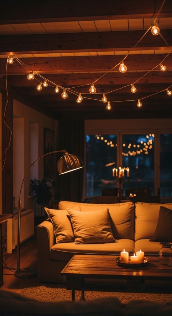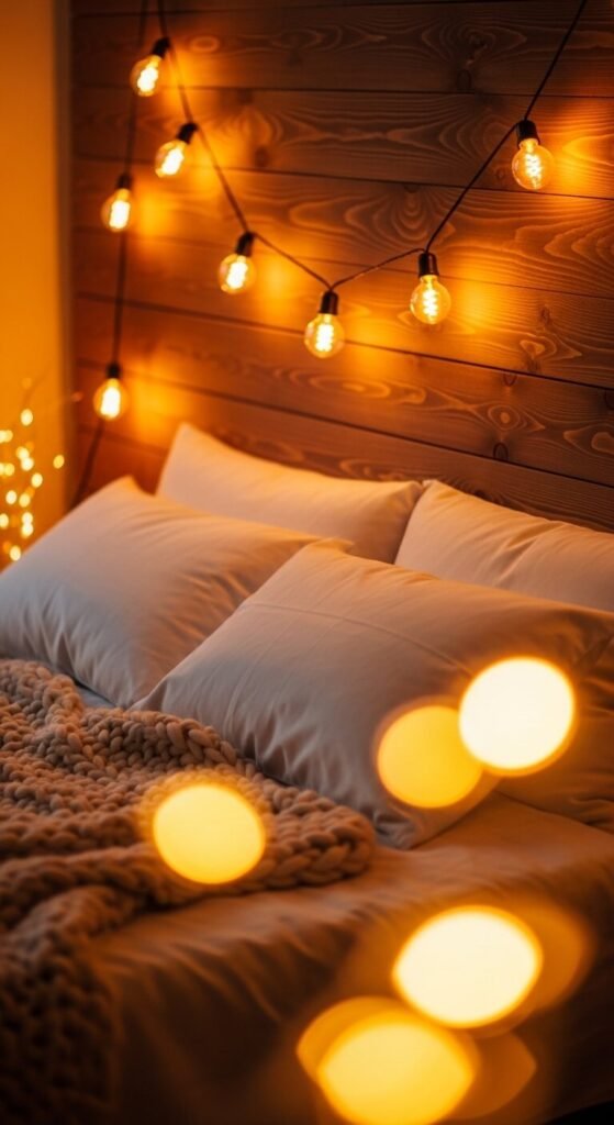 String lights are not just for December. Drape them along a headboard, weave them through a bookshelf, or hang them in a loose zigzag across a bedroom ceiling. They add instant warmth without any hardwiring. A 10-meter strand of warm Edison-style string lights runs about $12–$20 online. Use adhesive hooks to hang them with zero wall damage — perfect for renters. They work in living rooms, balconies, and even bathrooms above a mirror.