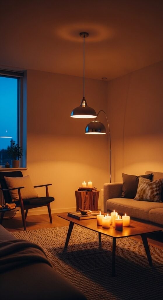 Never rely on just one light source. Rooms that feel flat usually have a single overhead light doing all the work. The fix is layering: use an overhead for general light, a floor or table lamp for mid-level warmth, and candles or small accent lights low to the ground. This three-layer approach mimics how light naturally exists outdoors. It adds dimension and depth. You don’t need to buy everything at once — start with one floor lamp and build from there.