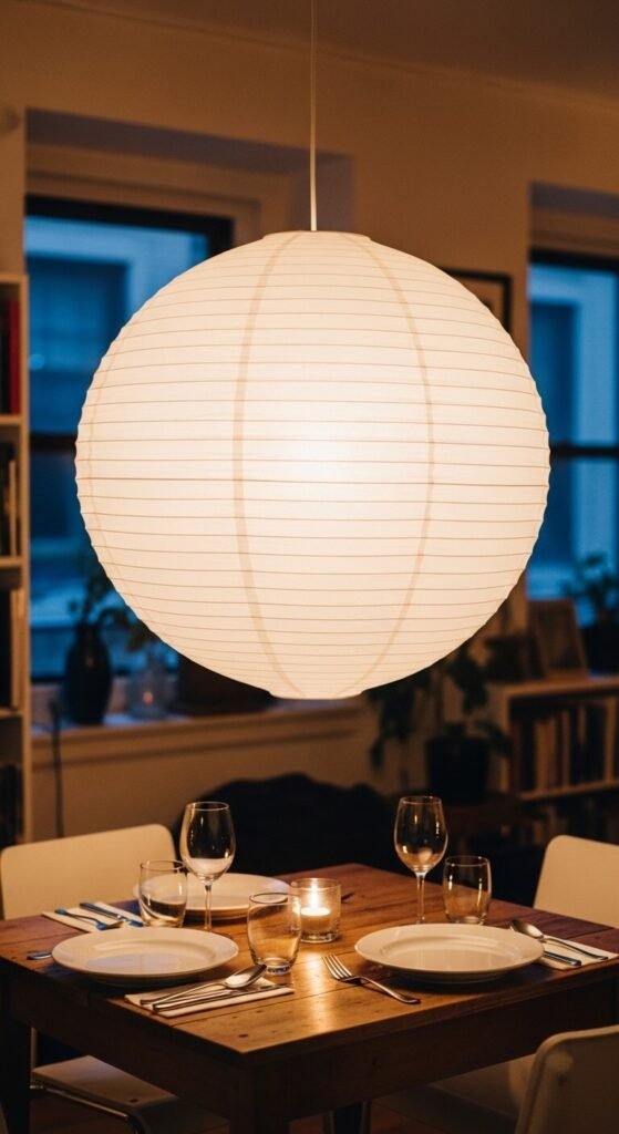 A bare hanging bulb gives harsh, unflattering light. A paper lantern shade slips over it and diffuses the glow into something soft and even. They cost as little as $5 and come in dozens of sizes. Hang a large one over a dining table or a cluster of small ones in a bedroom corner. They work best with warm white bulbs inside. This is one of the easiest renter-friendly upgrades because it requires no tools — the lantern simply sits over the existing bulb socket.
