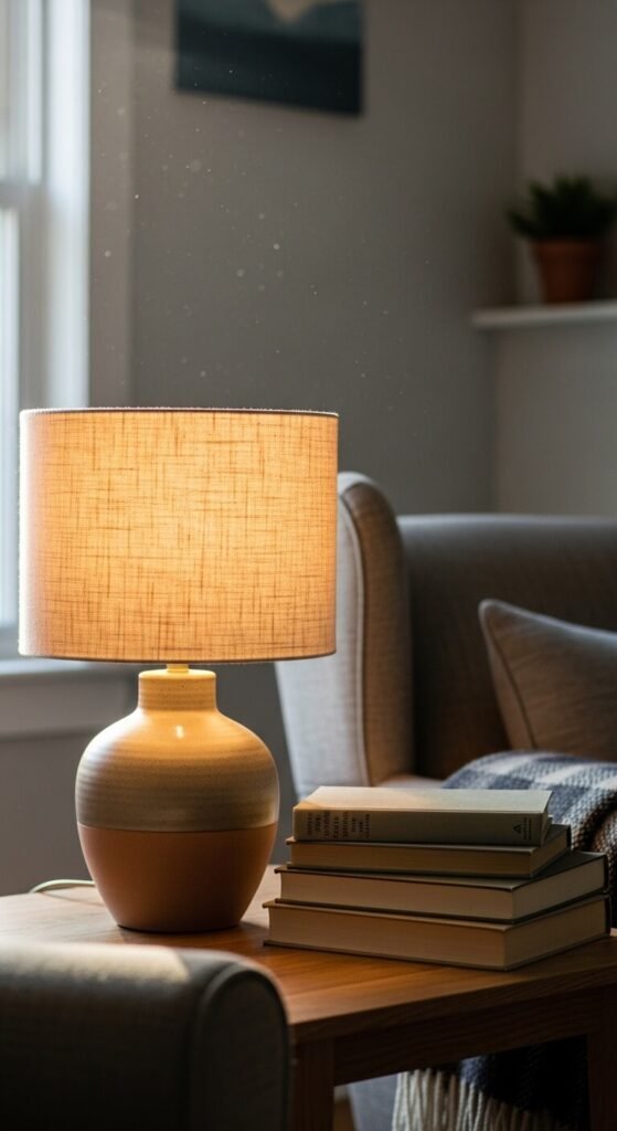 The shade material matters as much as the bulb. Linen and fabric shades filter light into something warm and diffused. White plastic or metal shades create a brighter, harder light. Thrift stores are full of lamps with great bones — just an ugly shade. Buy a replacement linen shade for $15–$30 and swap it out. Instant upgrade. Place the lamp at eye level when you’re seated — not overhead — and you’ll feel the difference in how the room relaxes.