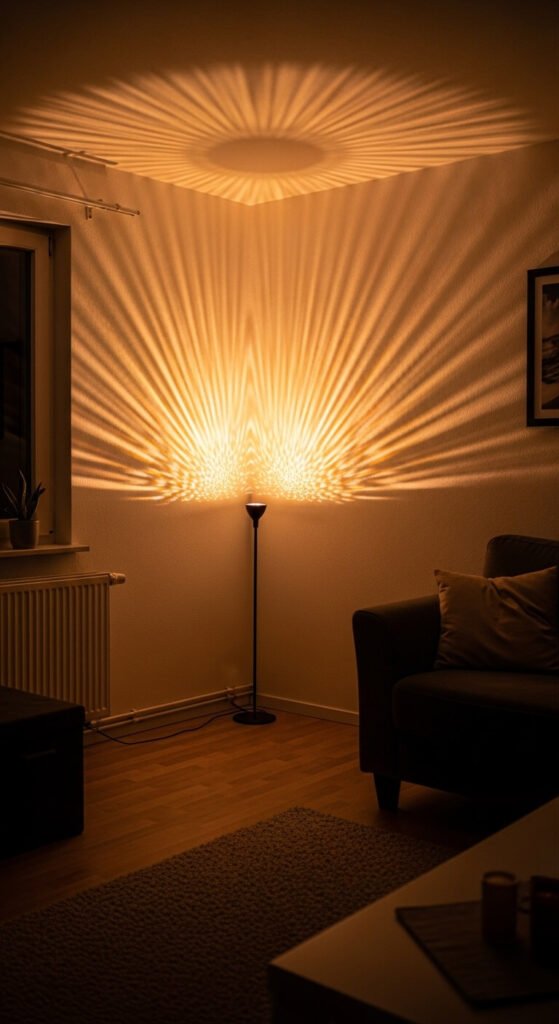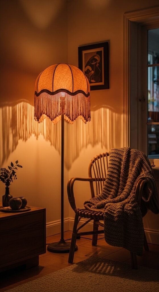 A fringed floor lamp does two things: it provides warm directional light and creates a texture effect on nearby walls through the fringe. The shadows the fringe casts are constantly shifting and organic-looking. These lamps show up constantly at thrift stores and vintage markets for $20–$60. Pair it with a 2700K bulb and place it next to an armchair. It’s one corner, one lamp, one afternoon to set up — and it becomes the coziest spot in your home.