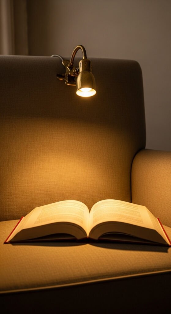 You don’t need a dedicated room to have a reading nook. A clip-on adjustable spotlight ($12–$25) attached to a shelf or chair gives you exactly the right amount of focused light without illuminating the whole room. This lets one person read while the other sleeps. It keeps the rest of the room dim and cozy. Choose a warm-toned bulb. Brass or black finishes look clean and deliberate. It’s a tiny purchase that significantly improves how you use your space at night.
