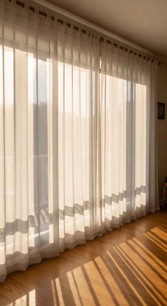 This is a design trick and a lighting trick at once. Hang curtains from ceiling height — even if your window is halfway down the wall. When light comes through sheer curtains, it gets diffused across the whole room. At night, backlit sheers with a warm lamp behind them glow like a soft lantern. Use white or cream linen sheers for maximum light diffusion. The curtains themselves don’t need to be expensive — IKEA has affordable options. The placement does all the work.