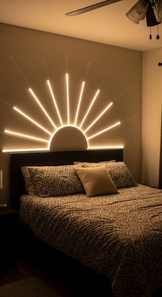 Run LED strip lights along the back edge of a geometric washi tape design on your wall. The tape creates the shape; the light lives just behind it. The effect in a dim room is a glowing art installation that cost under $25 total. This is completely removable — no damage to walls. Great for renters, kids’ rooms, or anyone who wants something visually interesting that also functions as ambient lighting. Use warm white strips to keep the mood cozy rather than electric.