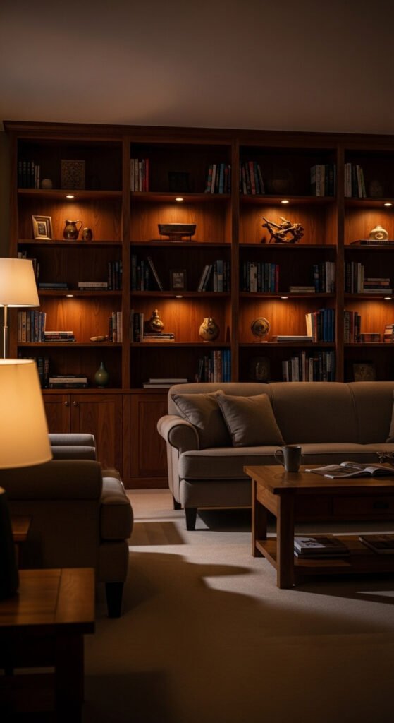Battery-powered puck lights (about $15–$20 for a pack of six) stuck inside a bookshelf transform it from storage into a feature wall. Place them at the back of each shelf so they wash the books and objects in front with a warm glow. Use them in kitchen cabinets with glass fronts, too. No wiring. No drilling. Just peel, stick, and switch on. They run on AA batteries or USB. Add a timer so they turn on and off automatically each evening.
